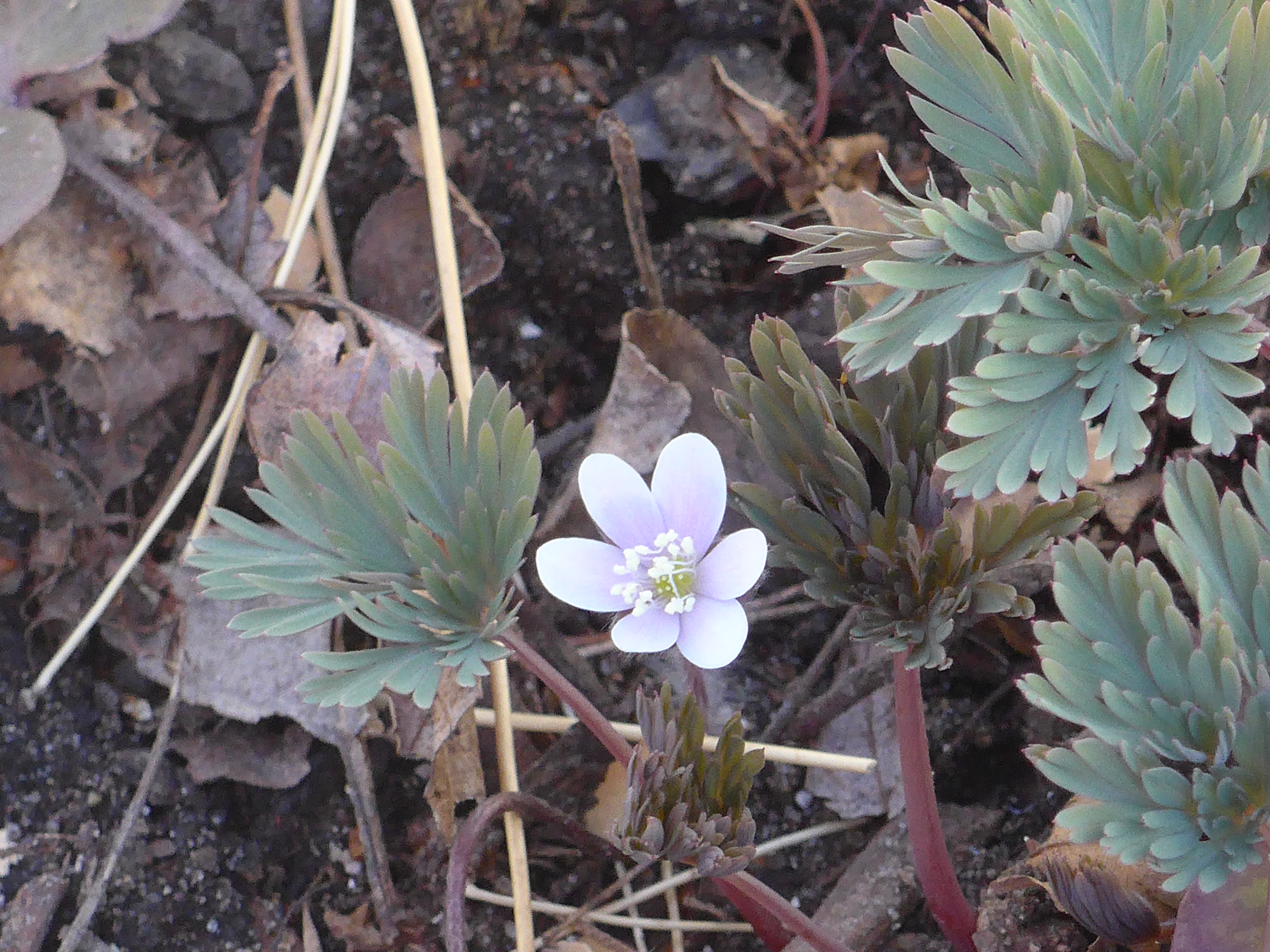 I also have a wild Hepatica – smaller and lighter blossom – peeking out from behind Dutchman’s breeches foliage