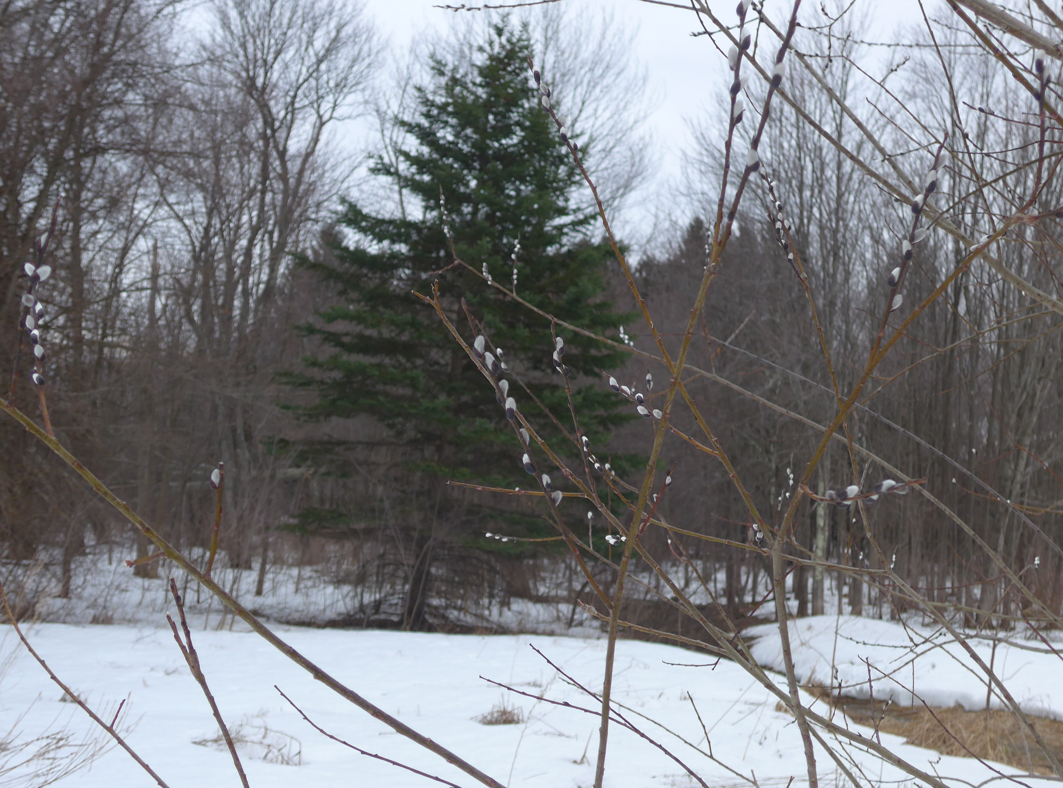 The deer fence (fishing line strung between stakes) held up and the deer did not get into the azaleas.  I think I will leave the fence up for awhile though because any deer who survived will be ravenous.  I scouted around the yard and found pussy willows