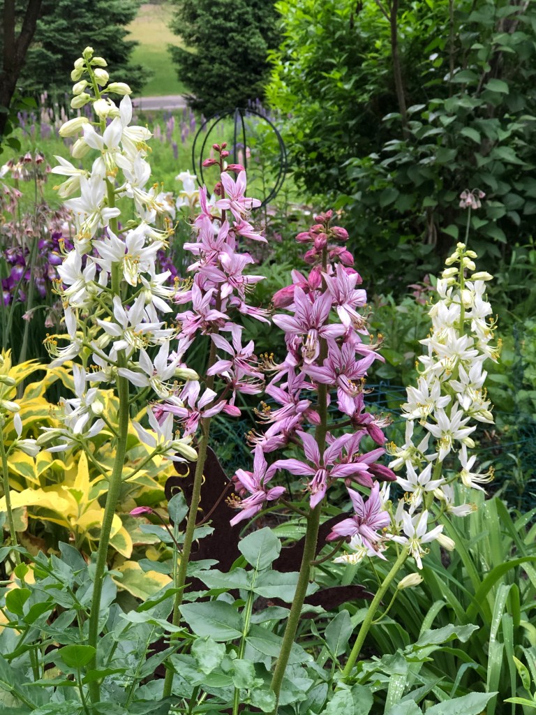 Early daylily “Elizabeth”, Iris “Eleanor Roosevelt”, Columbine “Green Apples”