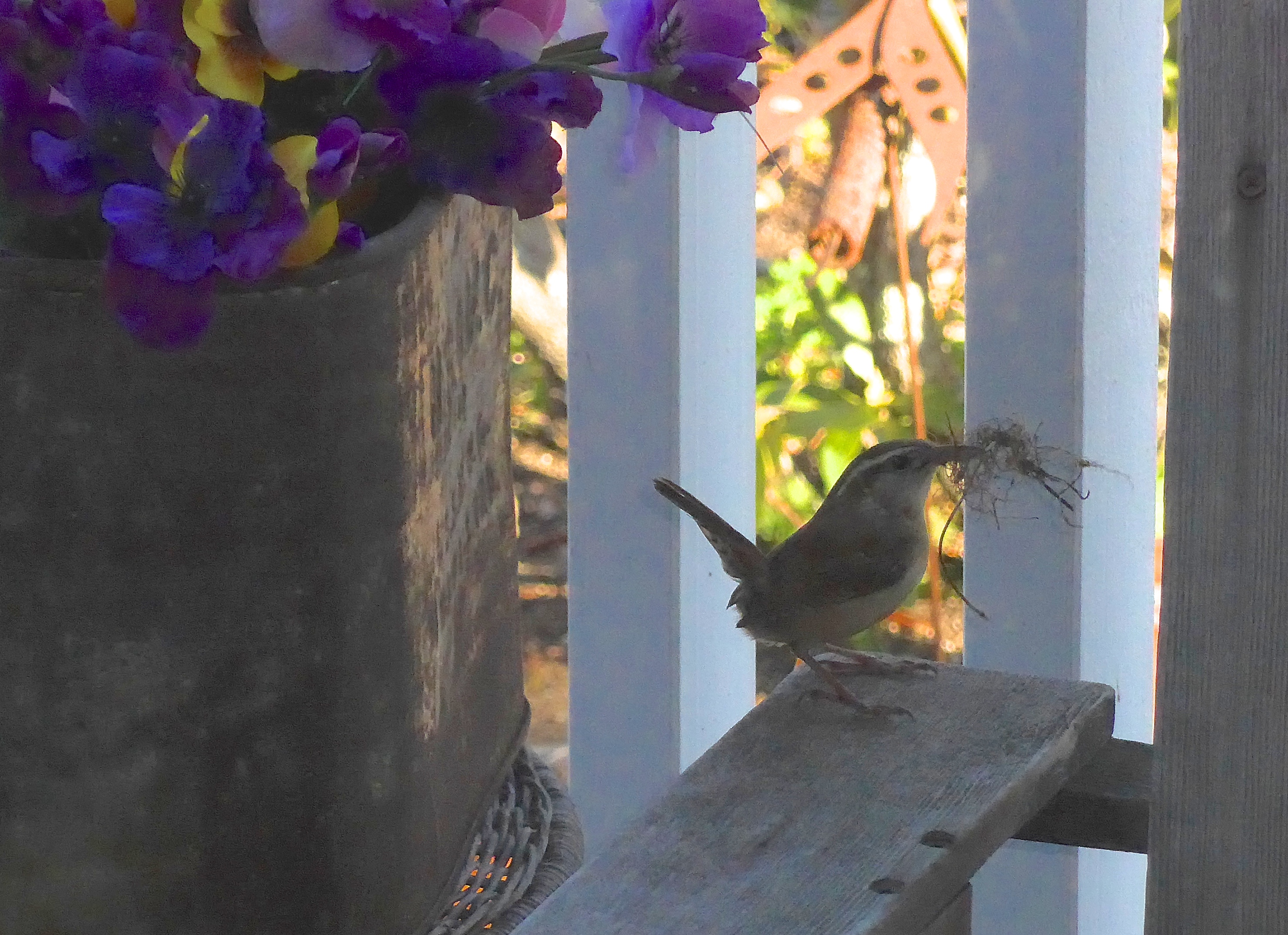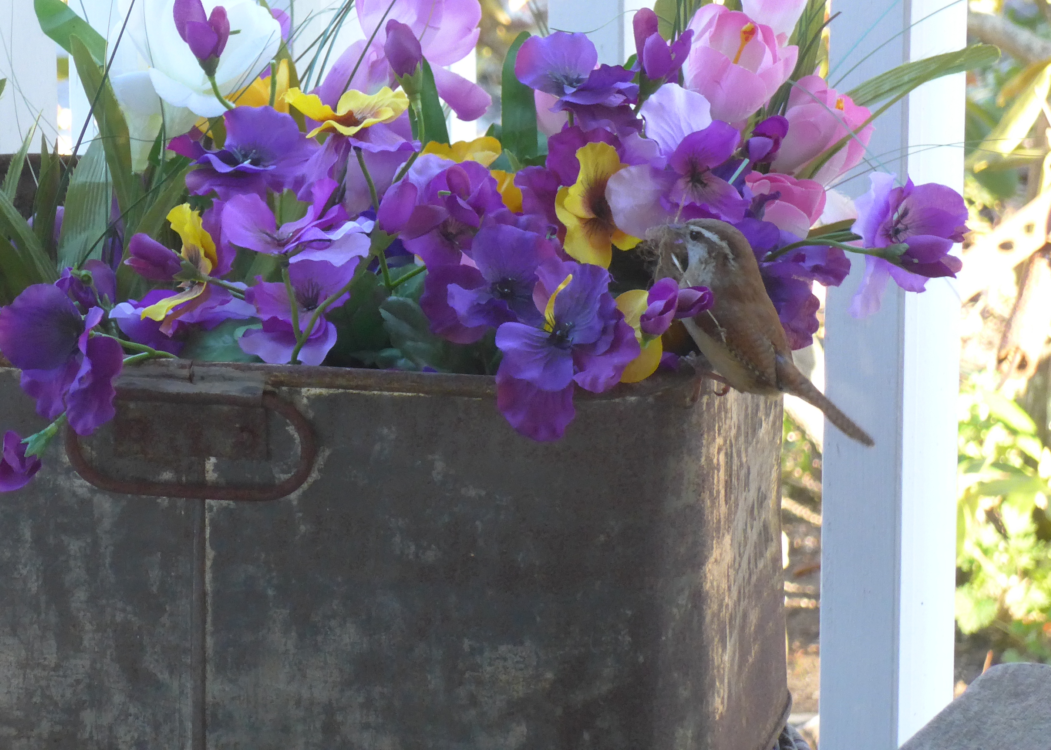 Some Carolina wrens have decided that they would like to raise a family in the bin with the fake pansies that I put on the porch a few weeks ago before the real pansies were available.